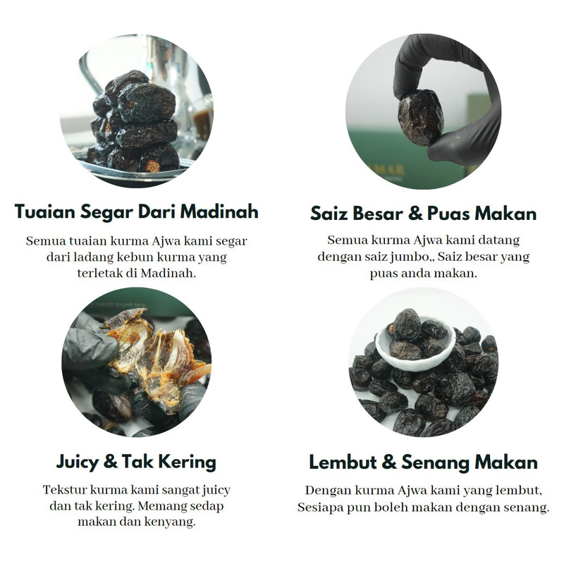 Istimewanya Kurma Ajwa kami adalah pada jaminan tuaian paling segar ,paling lembut ,paling besar dan paling puas untuk anda makan dan sedekah kepada orang lain.